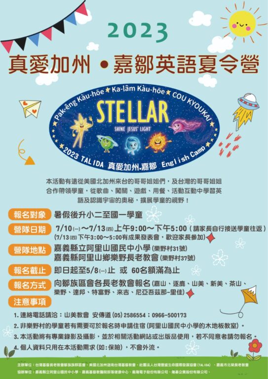 公告:2023年7月3-7日將在嘉義市北榮長老教會舉辦「真愛加州.嘉鄒英語夏令營」(已額滿)。7月10-13日在阿里山鄉樂野村舉辦為期四天的營會,尚有名額,歡迎鄒族兒童報名參加。