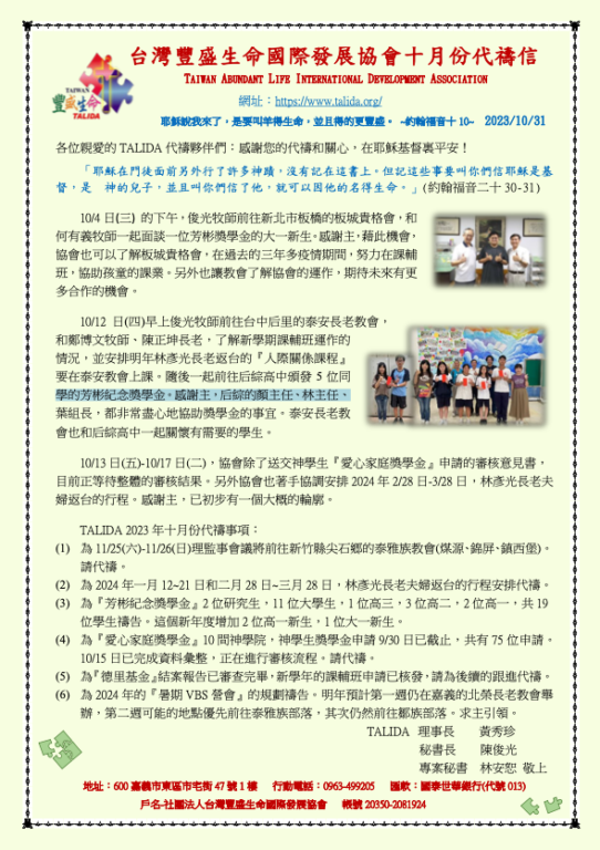 台灣豐盛生命國際發展協會2023年10月份代禱信