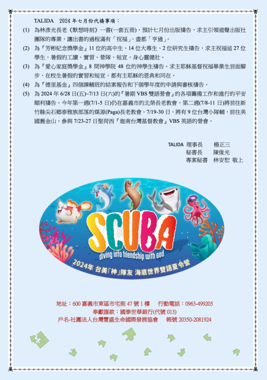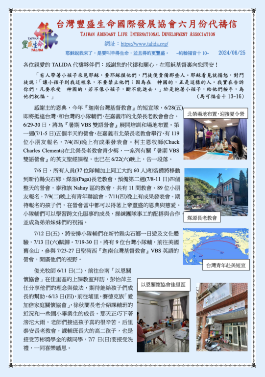 台灣豐盛生命國際發展協會2024年06月份代禱信