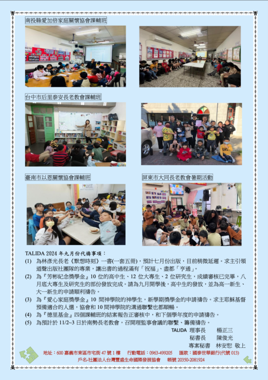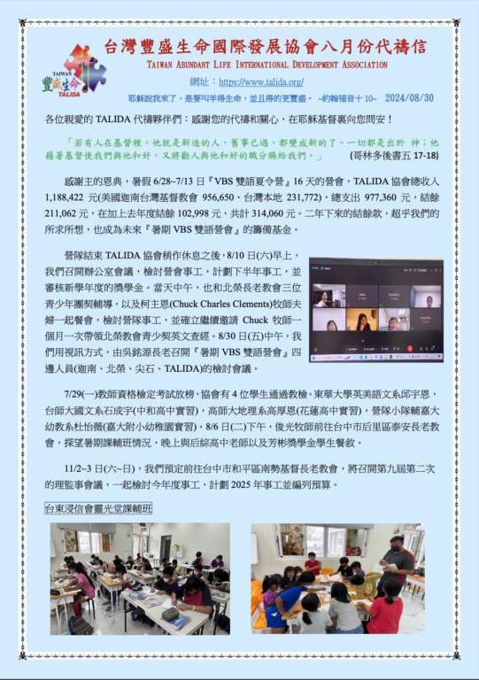台灣豐盛生命國際發展協會2024年08月份代禱信