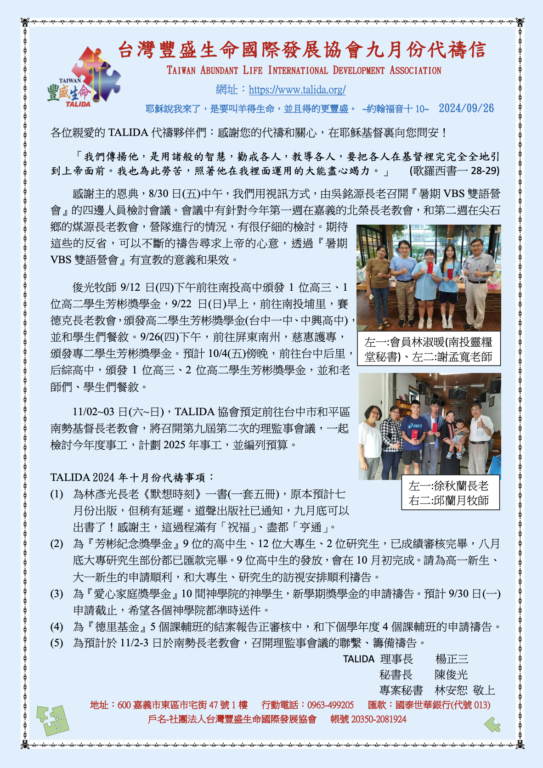 台灣豐盛生命國際發展協會2024年09月份代禱信