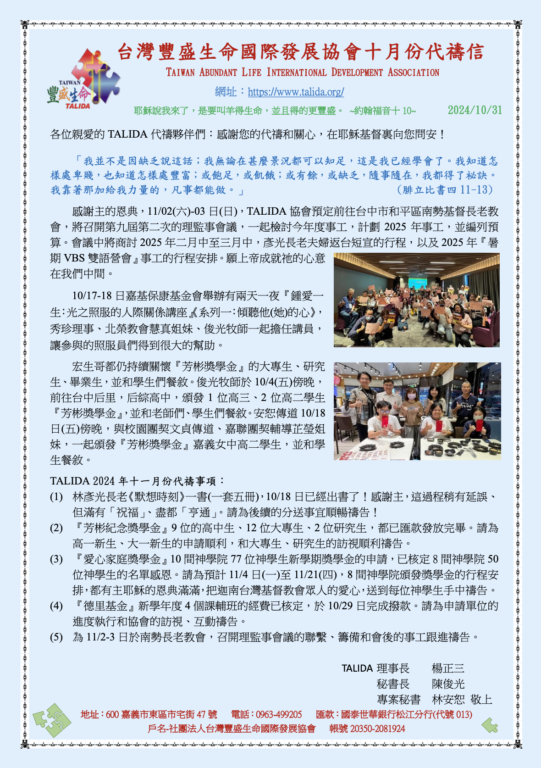台灣豐盛生命國際發展協會2024年10月份代禱信