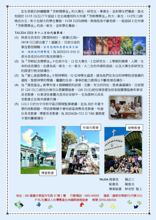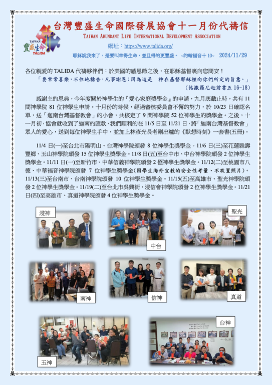 台灣豐盛生命國際發展協會2024年11月份代禱信