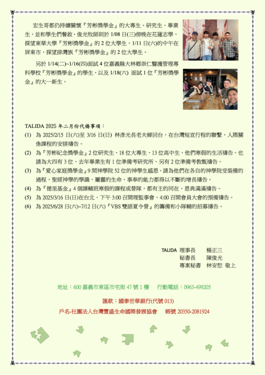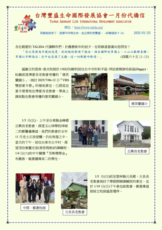 台灣豐盛生命國際發展協會2025年01月份代禱信