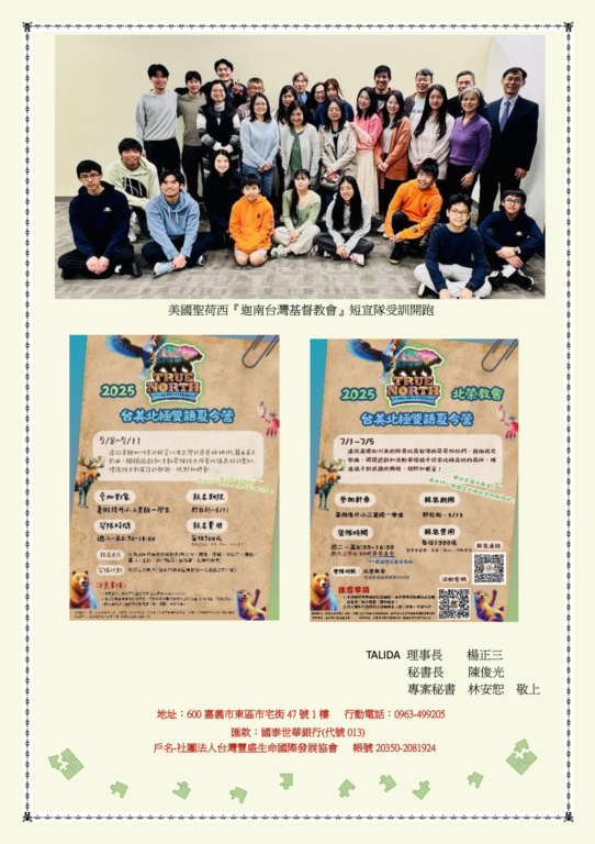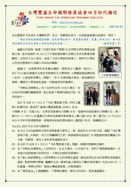 台灣豐盛生命國際發展協會2025年04月份代禱信