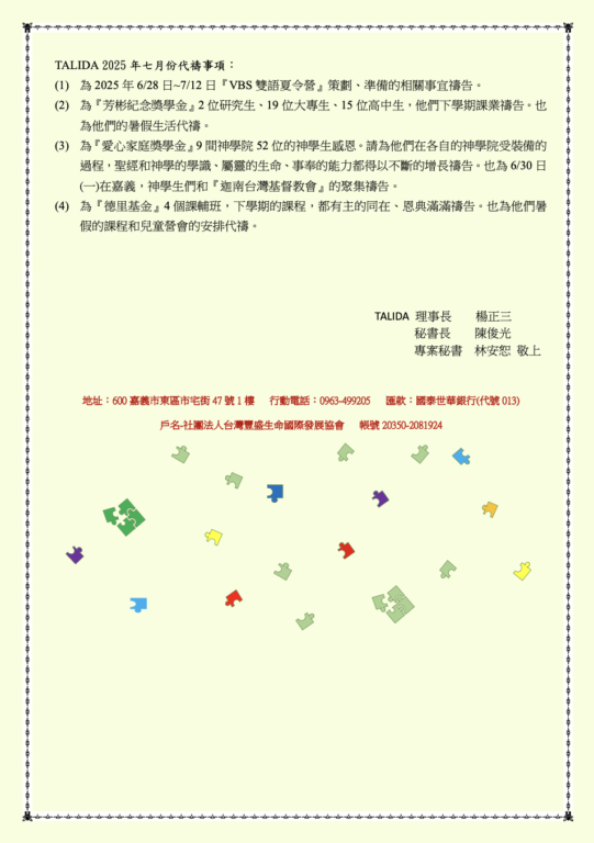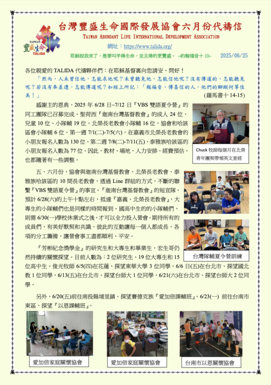 台灣豐盛生命國際發展協會2025年6月份代禱信