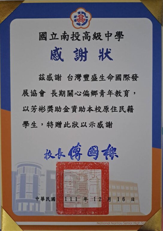 111學年度上學期協會秘書長 陳俊光牧師頒發后里綜合高中 及南投高中 學生 『芳彬紀念獎學金』,鼓勵原住民、新住民等學生努力向學,朝著自我的夢想及目標前進,有一天能夠回饋家鄉及社會。