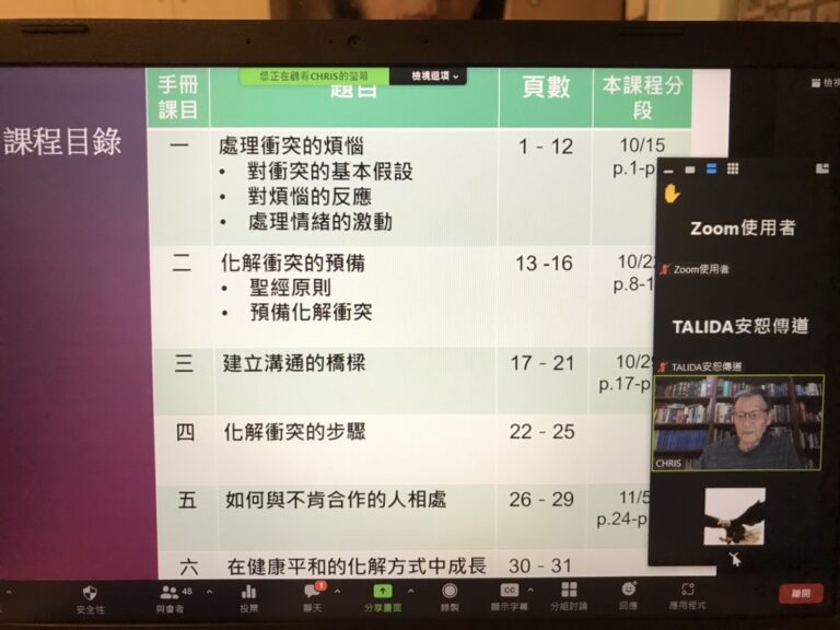 2022年10月15日起每週六上午9:30~11:30由彰化永福長老教會開辦「人際關係課程第四系列-化解衝突 追求和睦」,由美國迦南台灣基督教會林彥光長老授課,共80位報名參加。